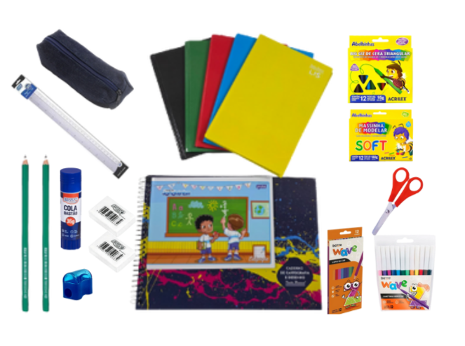 Contém 24 itens essenciais de papelaria, incluindo cadernos, estojo, lápis, canetinha, lápis de cor, tesoura e materiais artísticos. Ideal para listas escolares econômicas e compras em volume. Qualidade garantida com marcas BRW, Lyke, Masterprint, Pauta Branca, Bazze, Acrilex e Maxcril.