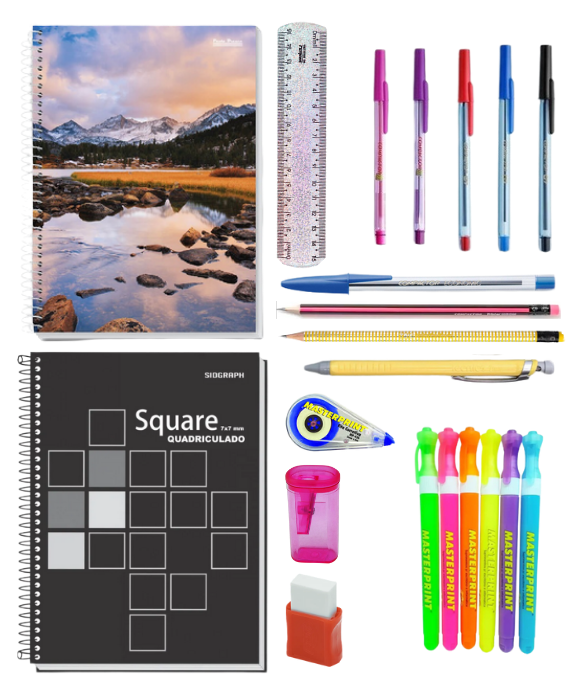 Contém 16 itens essenciais de papelaria, qualidade garantida com marcas BRW, Masterprint, Cis, PA, SP e Compactor.