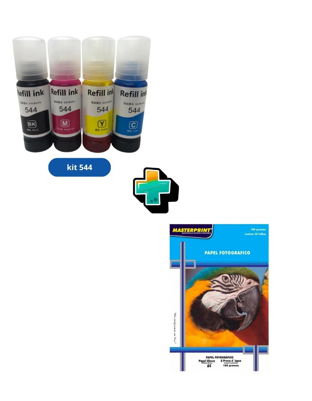 O kit é composto de 04 refil de tinta compatível para impressora modelo T544 nas cores preta, ciano, amarela e magenta, pronto para uso com 70ml cada refil e bico que se encaixa perfeitamente ao equipamento na hora de abastecer proporcionando o abastecimento de forma limpa e segura mais 50 folhas de papel fotográfico A4 glossy brilhante de alta qualidade